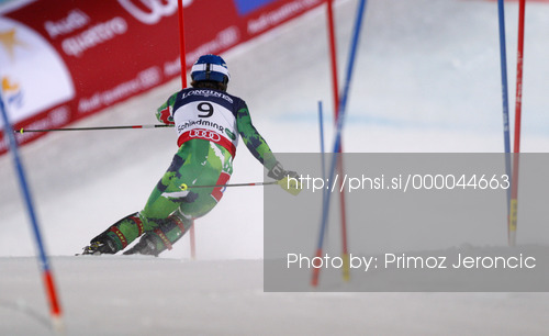 : Andreas Romar of Finland skiing in slalom of men super combined race of FIS Alpine skiing World Championships in Schladming, Austria. Slalom of men super combined race of FIS Alpine skiing World championships Schladming 2013, was held in Schladming, Austria, on Monday, 11th of February 2013.