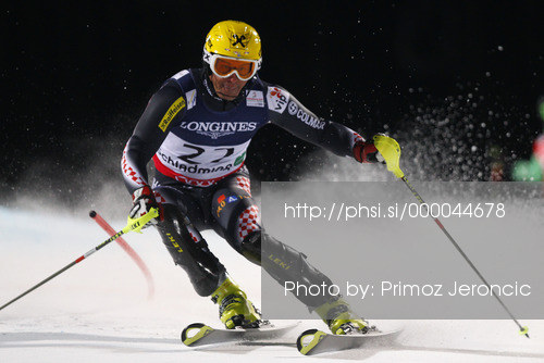 : Second placed Ivica Kostelic of Croatia skiing in slalom of men super combined race of FIS Alpine skiing World Championships in Schladming, Austria. Slalom of men super combined race of FIS Alpine skiing World championships Schladming 2013, was held in Schladming, Austria, on Monday, 11th of February 2013.