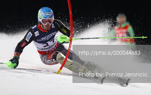 : Winner and new super combined World Champion Ted Ligety of USA skiing in slalom of men super combined race of FIS Alpine skiing World Championships in Schladming, Austria. Slalom of men super combined race of FIS Alpine skiing World championships Schladming 2013, was held in Schladming, Austria, on Monday, 11th of February 2013.