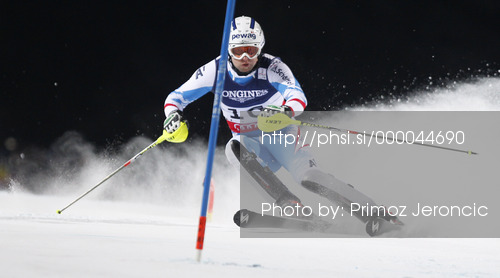 : Third placed Romed Baumann of Austria skiing in slalom of men super combined race of FIS Alpine skiing World Championships in Schladming, Austria. Slalom of men super combined race of FIS Alpine skiing World championships Schladming 2013, was held in Schladming, Austria, on Monday, 11th of February 2013.