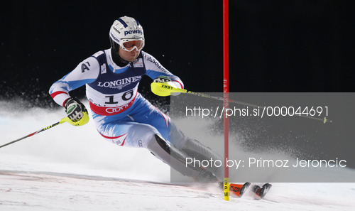 : Third placed Romed Baumann of Austria skiing in slalom of men super combined race of FIS Alpine skiing World Championships in Schladming, Austria. Slalom of men super combined race of FIS Alpine skiing World championships Schladming 2013, was held in Schladming, Austria, on Monday, 11th of February 2013.