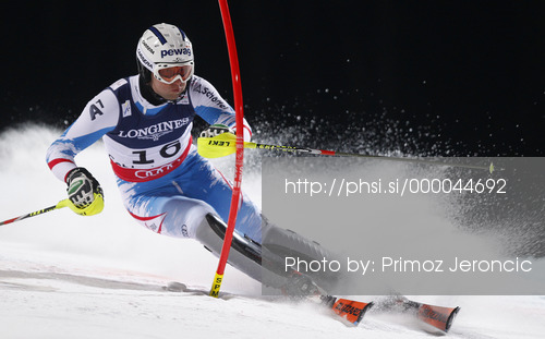 : Third placed Romed Baumann of Austria skiing in slalom of men super combined race of FIS Alpine skiing World Championships in Schladming, Austria. Slalom of men super combined race of FIS Alpine skiing World championships Schladming 2013, was held in Schladming, Austria, on Monday, 11th of February 2013.