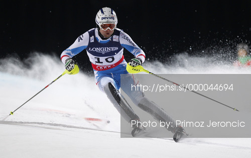 : Third placed Romed Baumann of Austria skiing in slalom of men super combined race of FIS Alpine skiing World Championships in Schladming, Austria. Slalom of men super combined race of FIS Alpine skiing World championships Schladming 2013, was held in Schladming, Austria, on Monday, 11th of February 2013.