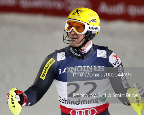 : Second placed Ivica Kostelic of Croatia reacts in finish of men super combined race of FIS Alpine skiing World Championships in Schladming, Austria. Slalom of men super combined race of FIS Alpine skiing World championships Schladming 2013, was held in Schladming, Austria, on Monday, 11th of February 2013.