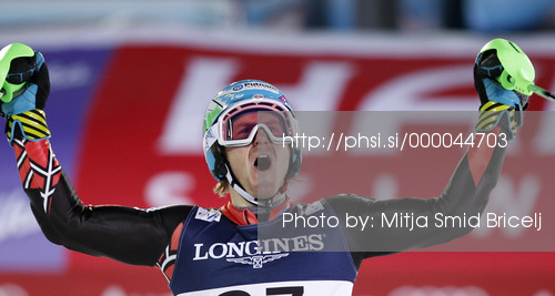 : Winner and new super combined World Champion Ted Ligety of USA reacts in finish of men super combined race of FIS Alpine skiing World Championships in Schladming, Austria. Slalom of men super combined race of FIS Alpine skiing World championships Schladming 2013, was held in Schladming, Austria, on Monday, 11th of February 2013.