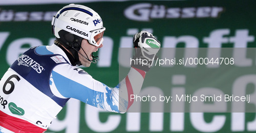 : Third placed Romed Baumann of Austria reacts in finish of men super combined race of FIS Alpine skiing World Championships in Schladming, Austria. Slalom of men super combined race of FIS Alpine skiing World championships Schladming 2013, was held in Schladming, Austria, on Monday, 11th of February 2013.