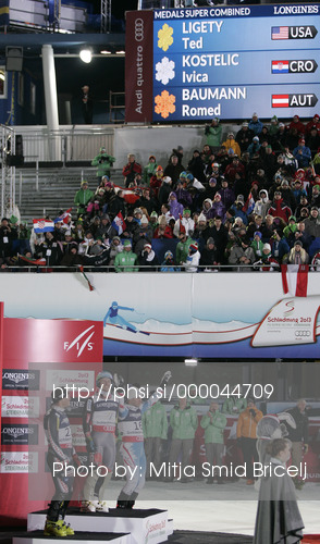 : Winner and new super combined World Champion Ted Ligety of USA (M), second placed Ivica Kostelic of Croatia (L) and third placed Romed Baumann of Austria (R) celebrate their medals won in men super combined race of FIS Alpine skiing World Championships in Schladming, Austria. Slalom of men super combined race of FIS Alpine skiing World championships Schladming 2013, was held in Schladming, Austria, on Monday, 11th of February 2013.
