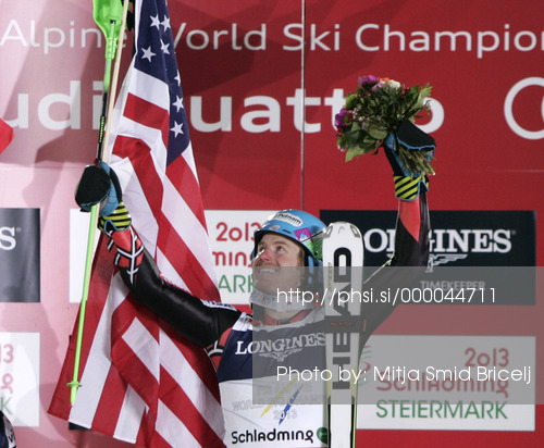 : Winner and new super combined World Champion Ted Ligety of USA celebrates his medal won in men super combined race of FIS Alpine skiing World Championships in Schladming, Austria. Slalom of men super combined race of FIS Alpine skiing World championships Schladming 2013, was held in Schladming, Austria, on Monday, 11th of February 2013.