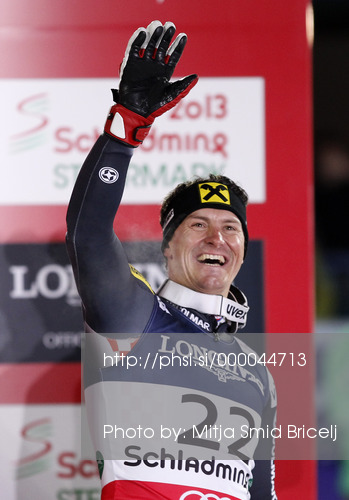 : Second placed Ivica Kostelic of Croatia celebrates his medal won in men super combined race of FIS Alpine skiing World Championships in Schladming, Austria. Slalom of men super combined race of FIS Alpine skiing World championships Schladming 2013, was held in Schladming, Austria, on Monday, 11th of February 2013.