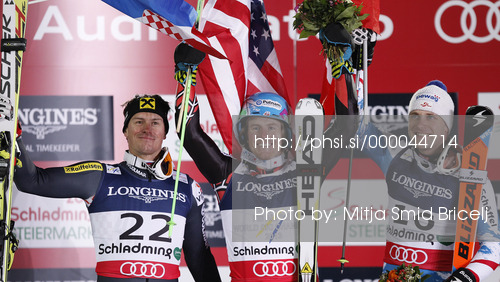 : Winner and new super combined World Champion Ted Ligety of USA (M), second placed Ivica Kostelic of Croatia (L) and third placed Romed Baumann of Austria (R) celebrate their medals won in men super combined race of FIS Alpine skiing World Championships in Schladming, Austria. Slalom of men super combined race of FIS Alpine skiing World championships Schladming 2013, was held in Schladming, Austria, on Monday, 11th of February 2013.
