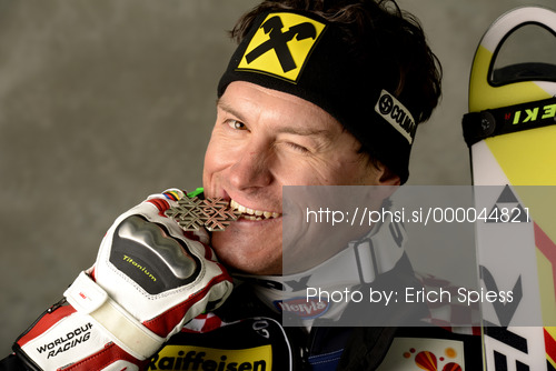 : Second placed Ivica Kostelic of Croatia celebrates his medal won in men super combined race of FIS Alpine skiing World Championships in Schladming, Austria. Slalom of men super combined race of FIS Alpine skiing World championships Schladming 2013, was held in Schladming, Austria, on Monday, 11th of February 2013.