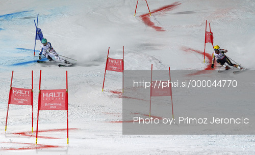 : Felix Neureuther of Germany (L) and Michael Janyk of Canada (R) skiing in Nations team event of FIS Alpine skiing World Championships in Schladming, Austria. Nations team event of FIS Alpine skiing World championships Schladming 2013, was held in Schladming, Austria, on Tuesday, 12th of February 2013.
