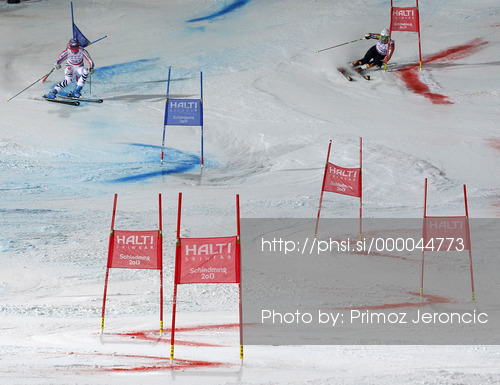 : Maria Hoefl-Riesch of Germany (L) and Erin Mielzynski of Canada (R) skiing in Nations team event of FIS Alpine skiing World Championships in Schladming, Austria. Nations team event of FIS Alpine skiing World championships Schladming 2013, was held in Schladming, Austria, on Tuesday, 12th of February 2013.