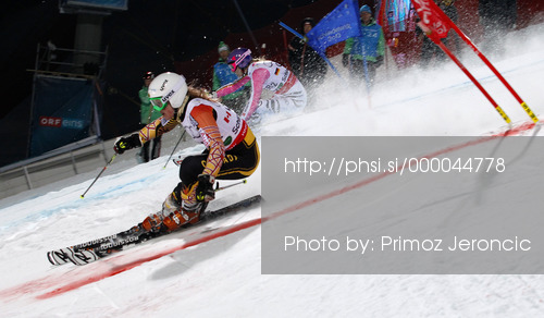 : Maria Hoefl-Riesch of Germany (R) and Erin Mielzynski of Canada (L) skiing in Nations team event of FIS Alpine skiing World Championships in Schladming, Austria. Nations team event of FIS Alpine skiing World championships Schladming 2013, was held in Schladming, Austria, on Tuesday, 12th of February 2013.