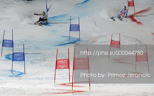 : Fritz Dopfer of Germany (R) and Philip Brown of Canada (L) skiing in Nations team event of FIS Alpine skiing World Championships in Schladming, Austria. Nations team event of FIS Alpine skiing World championships Schladming 2013, was held in Schladming, Austria, on Tuesday, 12th of February 2013.