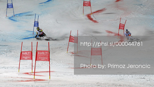: Fritz Dopfer of Germany (R) and Philip Brown of Canada (L) skiing in Nations team event of FIS Alpine skiing World Championships in Schladming, Austria. Nations team event of FIS Alpine skiing World championships Schladming 2013, was held in Schladming, Austria, on Tuesday, 12th of February 2013.