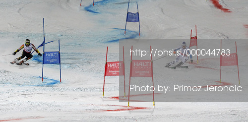 : Fritz Dopfer of Germany (R) and Philip Brown of Canada (L) skiing in Nations team event of FIS Alpine skiing World Championships in Schladming, Austria. Nations team event of FIS Alpine skiing World championships Schladming 2013, was held in Schladming, Austria, on Tuesday, 12th of February 2013.