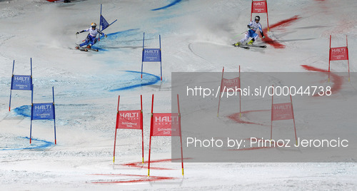 : Maria Pietilae Holmner of Sweden (L) and Nicole Hosp of Austria (R) skiing in Nations team event of FIS Alpine skiing World Championships in Schladming, Austria. Nations team event of FIS Alpine skiing World championships Schladming 2013, was held in Schladming, Austria, on Tuesday, 12th of February 2013.