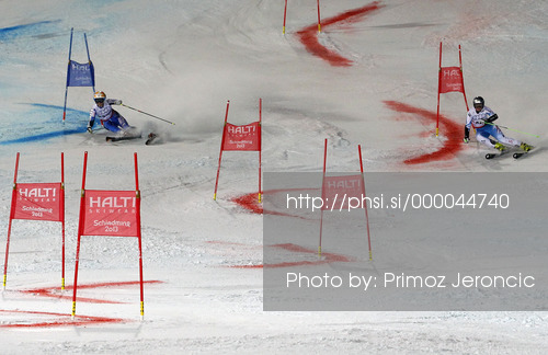 : Maria Pietilae Holmner of Sweden (L) and Nicole Hosp of Austria (R) skiing in Nations team event of FIS Alpine skiing World Championships in Schladming, Austria. Nations team event of FIS Alpine skiing World championships Schladming 2013, was held in Schladming, Austria, on Tuesday, 12th of February 2013.