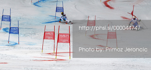: Mattias Hargin of Sweden (R) and Marcel Hirscher of Austria (L) skiing in Nations team event of FIS Alpine skiing World Championships in Schladming, Austria. Nations team event of FIS Alpine skiing World championships Schladming 2013, was held in Schladming, Austria, on Tuesday, 12th of February 2013.