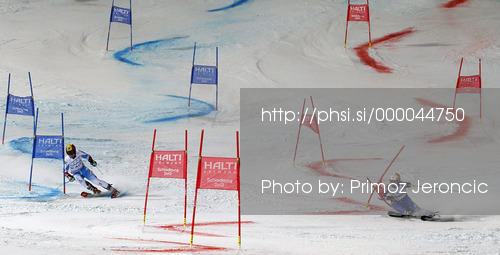 : Mattias Hargin of Sweden (R) and Marcel Hirscher of Austria (L) skiing in Nations team event of FIS Alpine skiing World Championships in Schladming, Austria. Nations team event of FIS Alpine skiing World championships Schladming 2013, was held in Schladming, Austria, on Tuesday, 12th of February 2013.