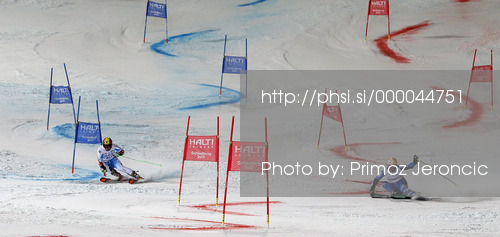 : Mattias Hargin of Sweden (R) and Marcel Hirscher of Austria (L) skiing in Nations team event of FIS Alpine skiing World Championships in Schladming, Austria. Nations team event of FIS Alpine skiing World championships Schladming 2013, was held in Schladming, Austria, on Tuesday, 12th of February 2013.
