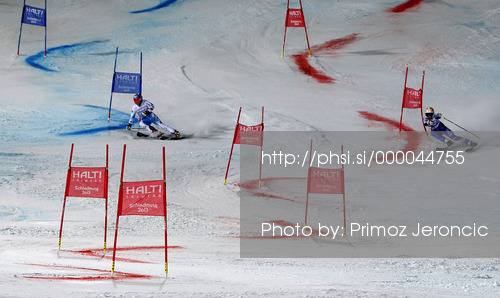 : Frida Hansdotter of Sweden (R) and Michaela Kirchgasser of Austria (L) skiing in Nations team event of FIS Alpine skiing World Championships in Schladming, Austria. Nations team event of FIS Alpine skiing World championships Schladming 2013, was held in Schladming, Austria, on Tuesday, 12th of February 2013.