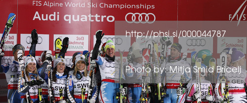 : First placed team Austria, second placed team Sweden and third placed team Germany celebrate their medals won in Nations team event of FIS Alpine skiing World Championships in Schladming, Austria. Nations team event of FIS Alpine skiing World championships Schladming 2013, was held in Schladming, Austria, on Tuesday, 12th of February 2013.