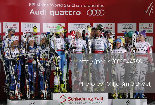 : First placed team Austria, second placed team Sweden and third placed team Germany celebrate their medals won in Nations team event of FIS Alpine skiing World Championships in Schladming, Austria. Nations team event of FIS Alpine skiing World championships Schladming 2013, was held in Schladming, Austria, on Tuesday, 12th of February 2013.