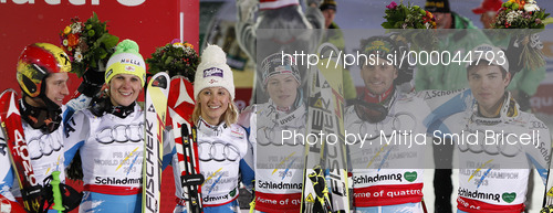 : Winning team Austria celebrate their medals won in Nations team event of FIS Alpine skiing World Championships in Schladming, Austria. Nations team event of FIS Alpine skiing World championships Schladming 2013, was held in Schladming, Austria, on Tuesday, 12th of February 2013.