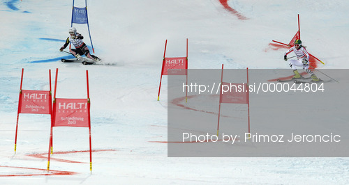 : Lena Duerr of Germany (R) and Sofija Novoselic of Croatia (L) skiing in Nations team event of FIS Alpine skiing World Championships in Schladming, Austria. Nations team event of FIS Alpine skiing World championships Schladming 2013, was held in Schladming, Austria, on Tuesday, 12th of February 2013.