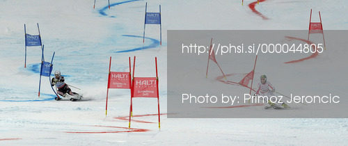 : Lena Duerr of Germany (R) and Sofija Novoselic of Croatia (L) skiing in Nations team event of FIS Alpine skiing World Championships in Schladming, Austria. Nations team event of FIS Alpine skiing World championships Schladming 2013, was held in Schladming, Austria, on Tuesday, 12th of February 2013.