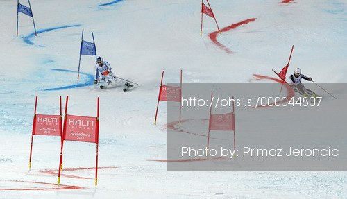: Fritz Dopfer of Germany (L) and Dalibor Samsal of Croatia (R) skiing in Nations team event of FIS Alpine skiing World Championships in Schladming, Austria. Nations team event of FIS Alpine skiing World championships Schladming 2013, was held in Schladming, Austria, on Tuesday, 12th of February 2013.