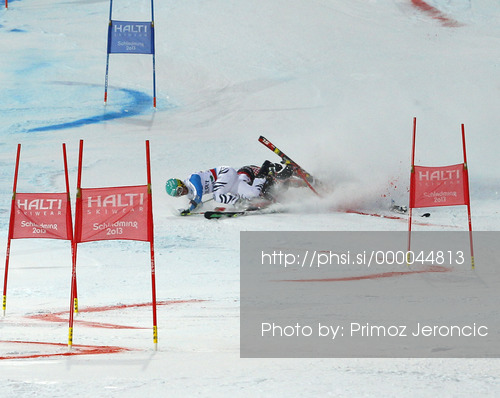: Felix Neureuther of Germany and Filip Zubcic of Croatia crashing in Nations team event of FIS Alpine skiing World Championships in Schladming, Austria. Nations team event of FIS Alpine skiing World championships Schladming 2013, was held in Schladming, Austria, on Tuesday, 12th of February 2013.