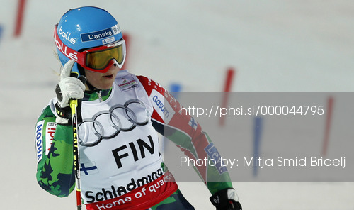 : Tanja Poutiainen of Finland reacts in finish of Nations team event of FIS Alpine skiing World Championships in Schladming, Austria. Nations team event of FIS Alpine skiing World championships Schladming 2013, was held in Schladming, Austria, on Tuesday, 12th of February 2013.