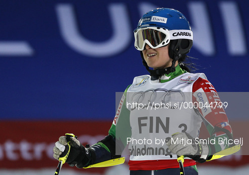: Merle Soppela of Finland reacts in finish of Nations team event of FIS Alpine skiing World Championships in Schladming, Austria. Nations team event of FIS Alpine skiing World championships Schladming 2013, was held in Schladming, Austria, on Tuesday, 12th of February 2013.