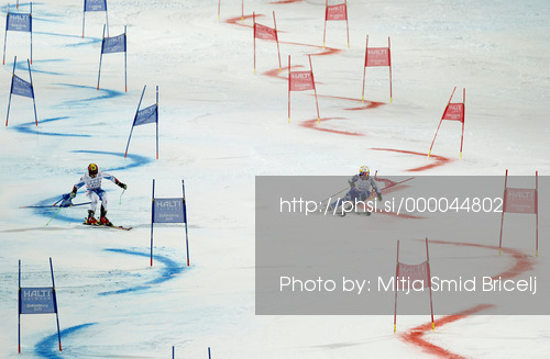 : Marcel Hirscher of Austria (L) and Mattias Hargin of Sweden (R) skiing in Nations team event of FIS Alpine skiing World Championships in Schladming, Austria. Nations team event of FIS Alpine skiing World championships Schladming 2013, was held in Schladming, Austria, on Tuesday, 12th of February 2013.