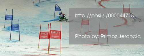 : Tanja Poutiainen of Finland (L) and Frida Hansdotter of Sweden (R) skiing in team event race of FIS Alpine skiing World Championships in Schladming, Austria. Slalom of men super combined race of FIS Alpine skiing World championships Schladming 2013, was held in Schladming, Austria, on Tuesday, 12th of February 2013.