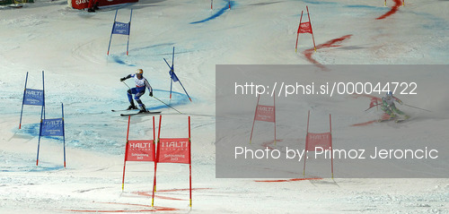 : Mattias Hargin of Sweden (L) and Marcus Sandell of Finland (R) skiing in team event race of FIS Alpine skiing World Championships in Schladming, Austria. Slalom of men super combined race of FIS Alpine skiing World championships Schladming 2013, was held in Schladming, Austria, on Tuesday, 12th of February 2013.