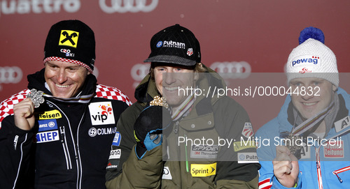 : Winner and new Super combined World Champion Ted Ligety of USA (M), second placed Ivica Kostelic of Croatia (L) and third placed Romed Baumann of Austria (R) celebrate their medals won in men super combined race of FIS Alpine skiing World Championships in Schladming, Austria. Men super combined race of FIS Alpine skiing World championships Schladming 2013, was held in Schladming, Austria, on Monday, 11th of February 2013.
