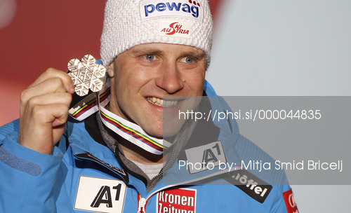 : Third placed Romed Baumann of Austria celebrates his medal won in men super combined race of FIS Alpine skiing World Championships in Schladming, Austria. Men super combined race of FIS Alpine skiing World championships Schladming 2013, was held in Schladming, Austria, on Monday, 11th of February 2013.
