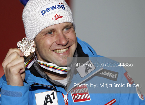 : Third placed Romed Baumann of Austria celebrates his medal won in men super combined race of FIS Alpine skiing World Championships in Schladming, Austria. Men super combined race of FIS Alpine skiing World championships Schladming 2013, was held in Schladming, Austria, on Monday, 11th of February 2013.