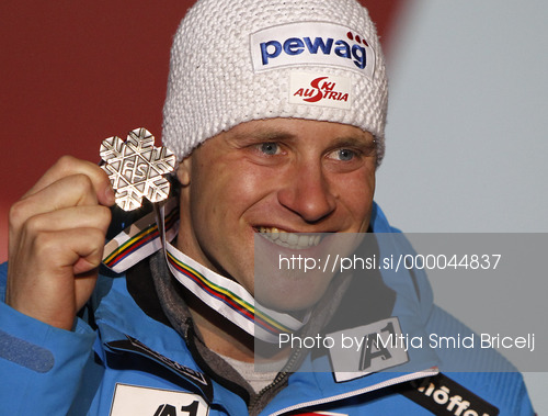 : Third placed Romed Baumann of Austria celebrates his medal won in men super combined race of FIS Alpine skiing World Championships in Schladming, Austria. Men super combined race of FIS Alpine skiing World championships Schladming 2013, was held in Schladming, Austria, on Monday, 11th of February 2013.