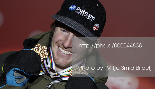 : Winner and new Super combined World Champion Ted Ligety of USA celebrates his medal won in men super combined race of FIS Alpine skiing World Championships in Schladming, Austria. Men super combined race of FIS Alpine skiing World championships Schladming 2013, was held in Schladming, Austria, on Monday, 11th of February 2013.