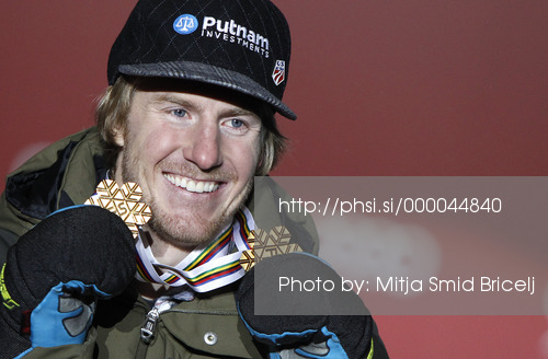 : Winner and new Super combined World Champion Ted Ligety of USA celebrates his medal won in men super combined race of FIS Alpine skiing World Championships in Schladming, Austria. Men super combined race of FIS Alpine skiing World championships Schladming 2013, was held in Schladming, Austria, on Monday, 11th of February 2013.