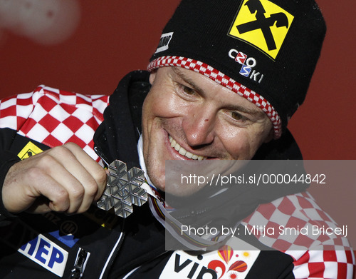 : Second placed Ivica Kostelic of Croatia celebrates his medal won in men super combined race of FIS Alpine skiing World Championships in Schladming, Austria. Men super combined race of FIS Alpine skiing World championships Schladming 2013, was held in Schladming, Austria, on Monday, 11th of February 2013.