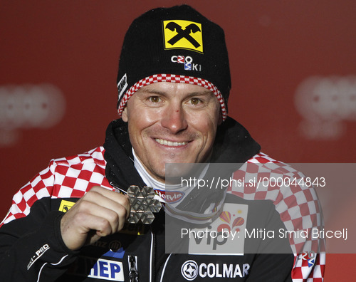 : Second placed Ivica Kostelic of Croatia celebrates his medal won in men super combined race of FIS Alpine skiing World Championships in Schladming, Austria. Men super combined race of FIS Alpine skiing World championships Schladming 2013, was held in Schladming, Austria, on Monday, 11th of February 2013.