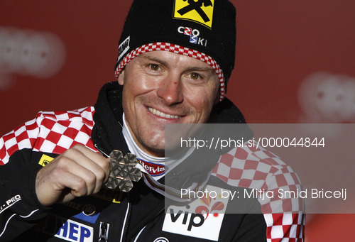 : Second placed Ivica Kostelic of Croatia celebrates his medal won in men super combined race of FIS Alpine skiing World Championships in Schladming, Austria. Men super combined race of FIS Alpine skiing World championships Schladming 2013, was held in Schladming, Austria, on Monday, 11th of February 2013.