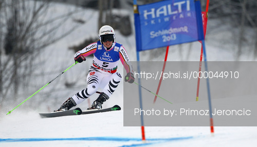 : Viktoria Rebensburg of Germany skiing in first run of women giant slalom race of FIS Alpine skiing World Championships in Schladming, Austria. Women giant slalom race of FIS Alpine skiing World championships Schladming 2013, was held in Schladming, Austria, on Thursday, 14th of February 2013.