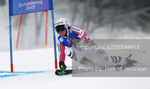 : Viktoria Rebensburg of Germany skiing in first run of women giant slalom race of FIS Alpine skiing World Championships in Schladming, Austria. Women giant slalom race of FIS Alpine skiing World championships Schladming 2013, was held in Schladming, Austria, on Thursday, 14th of February 2013.